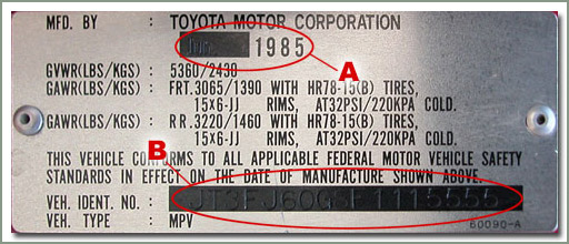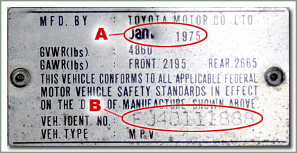 To determine the correct part number you need, it may be necessary to know the VIN, engine number, production date and/or model number of your Land Cruiser. The production date and VIN are printed on the Vehicle Identification Tag. This tag is either an aluminum plate or sticker located in one of three places, on the driver's door or door jam, under the hood on the firewall or on the inner passenger fender. 1958-1967 models were not required to have the production date stamped on the I.D. plate. Please provide full frame number when you order parts to assure correct information (not registered year).