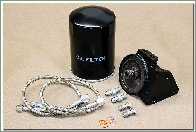 The Remote Oil Filter Kit is designed to up-date 1958-3/69 vehicles that have the original canister oil filter. The old canister filter assembly is getting difficult to get parts for. Most of the seals are no longer available. The canister filter is also messy to change. The kit comes with the spin on filter, bracket, oil lines, banjo bolts and sealing washers. Requires minor drilling to mount filter bracket. Bracket can be mounted to the old canister mount or to the inner fender well.| Buy | Quantity | Part Number | Description | Price | In Stock | Click for Zoom |