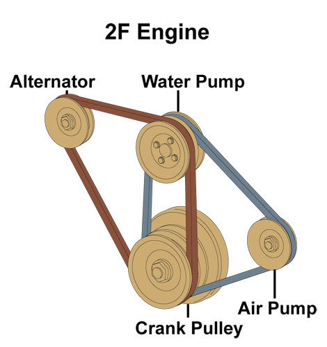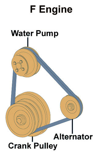 Specter uses only OEM Toyota Belts where possible Some belts have been discontinued. If we substitute a non-Toyota belt we offer an OEM quality belt. Specter recommends replacing all drive belts at the same time. Purchasing belts has been made easy with convenient sets available for most models (see listing below). Sets Include: fan belt, air pump belt, power steering and A/C belt for your year & model of Land Cruiser. Purchase belts individually if needed. When ordering individual belts, keep in mind that any one belt usually operates more than one accessory; i.e. the fan/water pump belt is the same as the alternator belt. Use the drawings above for reference. The drawings reflect most standard gasoline engine configurations through 1992.