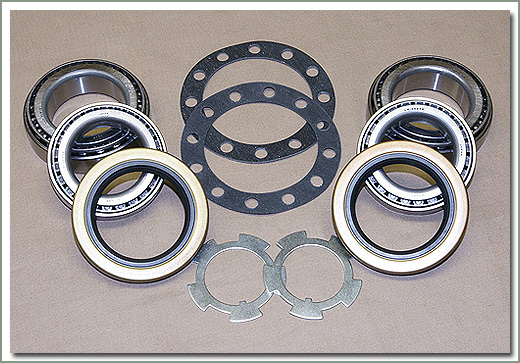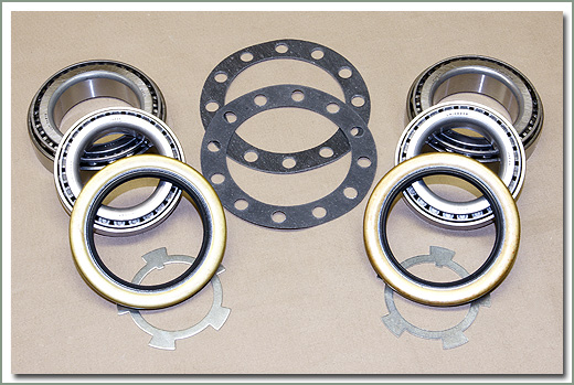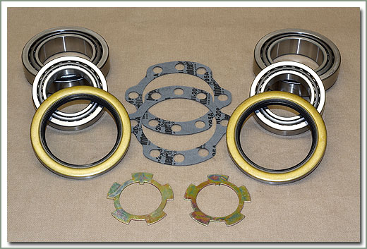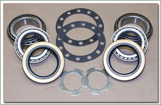 For replacing front wheel bearings, includes inner and outer wheel bearings, wheel seals, lock tabs, and hub gaskets. Kit does both sides. Does not include hub gaskets