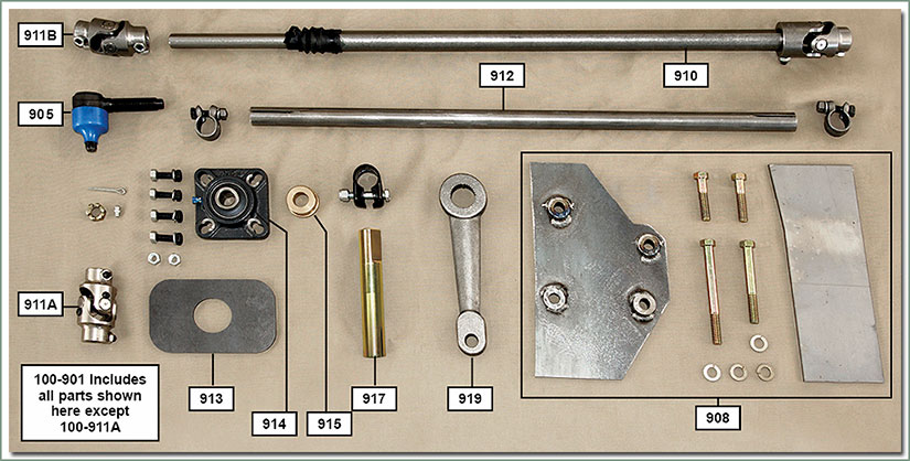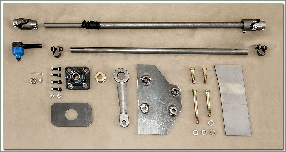 Saginaw power steering conversion Kit Fits 1958-1984 40 and 45 Series Left Hand Drive - Requires cutting, welding, and some fabrication - Comes with the steering box mounting plate, frame rail weld in gussets, steering shaft with u-joints, early and late style steering column mounts, tie rod end and correct length tie rod - Does NOT come with the steering box, power steering pump, pump brackets or hoses. Order Spud Shaft Separately to fit your steering box. See part numbers 100-917-30 and 100-917-36 On Sale - Everyone gets the Discounted Price on this part. (an Additional Handling Charge of 16.25 is already included in price) |