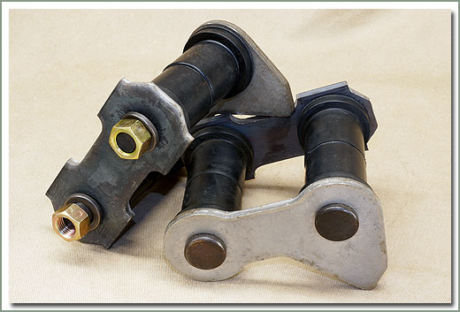 These stock length Tri-Shackles (also called Anti-Inversion Shackles) are case hardened for higher resistance to wear. All surfaces are machined for superior performance. They use stock size bushings, and are greasable. The idea of the Anti-Inversion is to eliminate the risk of shackles locking up to the frame under extreme conditions. This also happens when the spring length is too short. Some aftermarket springs and rearched springs require these shackles. They are plated for a higher resistance to rust. Bushings sold separately.