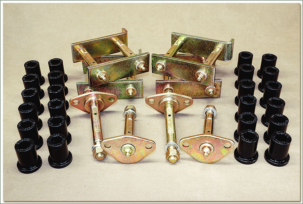 Set of 4 GREASEABLE SHACKLES, 4 GREASEABLE PINS, 24 POLY BUSHINGS Fits 1958-7/80 FJ40 front & rear - stock length. On Sale - Everyone gets the Discounted Price on this part. |