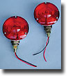 This pair of Auxiliary Tail Lights has 12 volt dual filament bulbs and is D.O.T. approved. The red lens is 4 inches in diameter. The lights stand 4 1/2 inches tall and are 2 3/4 inches thick. The mounting bolt is not adjustable and fits a 1/2 inch hole. These lights ground thru the body of the light and it has two power wires, one for each of the filaments in the bulb. Sold in pairs. |