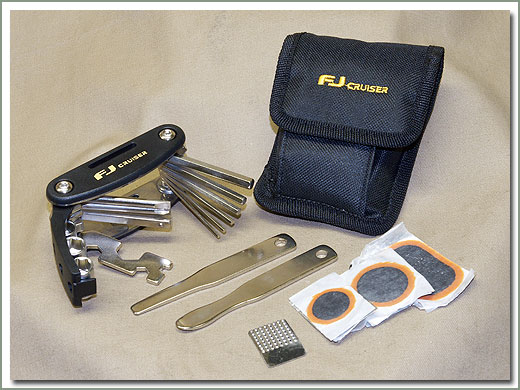FJ Cruiser Bike Tool This multi tool is made of high quality steel and stamped with the FJ Cruiser Logo. It comes with six different Allen wrenches (2, 2.5, 3, 4, 5, 6 mm), three socket wrench sizes (8, 9, 10 mm) with nut driver, three open end wrench sizes (8, 10, 15 mm), two screw drivers, two different tire spoons, a spoke tool (14 GE), six assorted patches, all in its own FJ Cruiser embroidered carrying case with belt loop. It comes in a shiny FJ Cruiser gift box. It's a tool even MacGyver would be proud to own. On Sale - Everyone gets the Discounted Price on this part. |