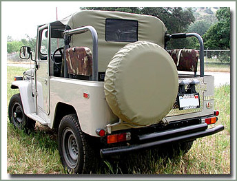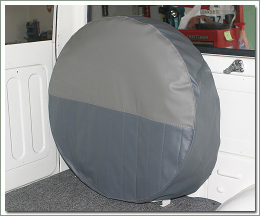 FJ45 LV wagon tire cover Fits 1963-1967 FJ45 LV wagon with O.E.M. tire size 29 inch by 9 inch tire. Two tone marine grade grey vinyl On Sale - Everyone gets the Discounted Price on this part. |