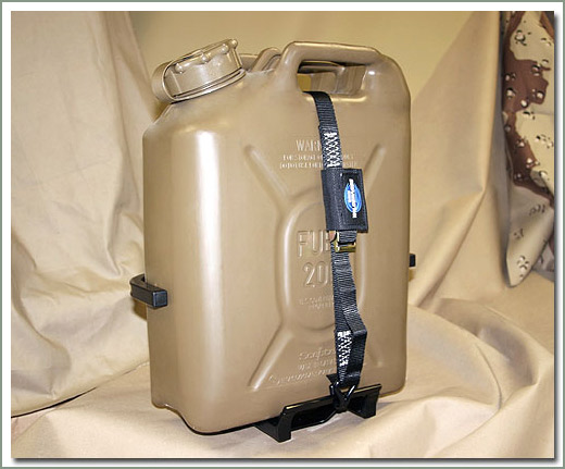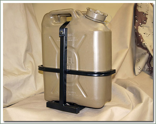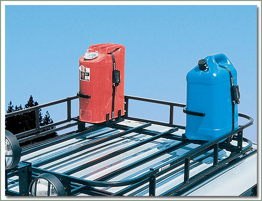 Gas/Water Can Mount Fits all 4 inch or 6 inch height Wilderness Racks with a floor kit - will accept the Blitz, Wedco Red 5 gallon gas cans and the Wedco Blue or Jerrican 5 gallon water cans - must have floor kit or two additional support points must be fabricated. |