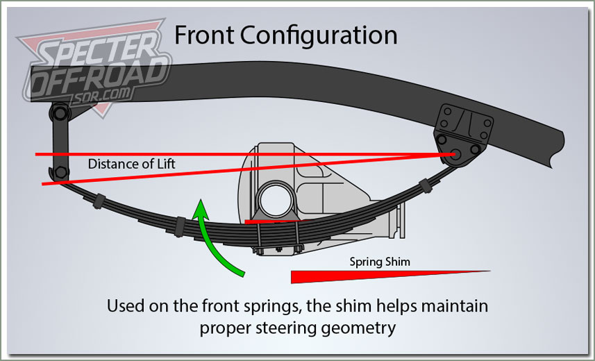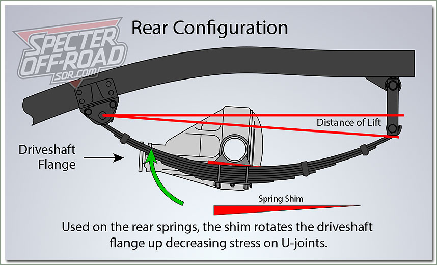 When you raise a vehicle by adding longer shackles, the axle housing rotates downward changing the angle of the differential and steering components. Using the proper shim rotates the axle and steering components back to the correct position. ![]() In the rear of the vehicle, extended shackles increase the operating angle of universal joints of the driveshaft. Use spring shims on rear leaf springs to rotate the front of the differential up and alleviate u-joint binding. If your suspension modification requires the use of spring shims, be sure to purchase leaf centering pins with extended heads to compensate for the additional space added between the spring and spring perch on the axle housing. See part number #287-36. |