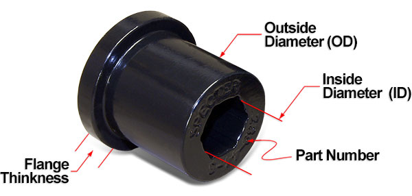 55 Series SOR Poly Bushing-Black graphite impregnated polyurethane Fits 1968-7/80 55 Series S-O-R Heavy Duty Shackles (#288-55). Specifications: I.D.=9/16 inch, O.D.=1 1/8 inch, Flange=.225-Sold each On Sale - Everyone gets the Discounted Price on this part. |