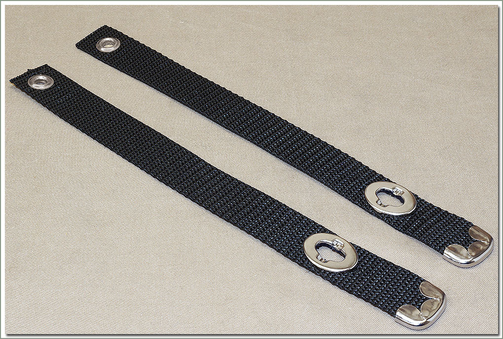 PAIR SOR BLACK JUMP SEAT STRAPS 1958-9/73 FJ40. Reproduction seat straps made with heavy duty strapping with metal tips. Approx length eyelet to eyelet is 7.5 inches. On Sale - Everyone gets the Discounted Price on this part. |