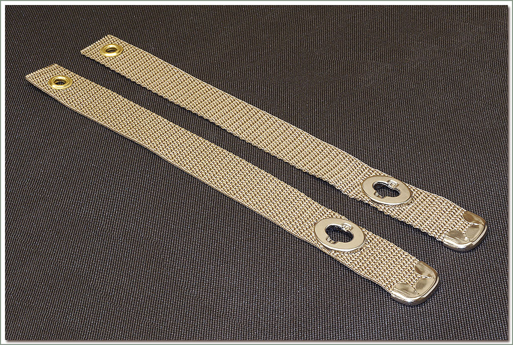 PAIR SOR TAN JUMP SEAT STRAPS 1958-9/73 FJ40. Reproduction seat straps made with heavy duty strapping with metal tips. Approx length eyelet to eyelet is 7.5 inches. On Sale - Everyone gets the Discounted Price on this part. |