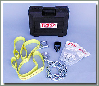 Hi-Lift Jack Company now provides a kit with accessories for the Hi-Lift Jack that allow it to be used as a winch. The Hi-Lift Winch Kit includes gloves, grab hook, chain, shackle, tree strap and jack attachment bracket. The Hi-Lift Winch Kit is supplied in a heavy duty plastic storage box with instructions. Rated capacity of kit components is 5000 lbs. |