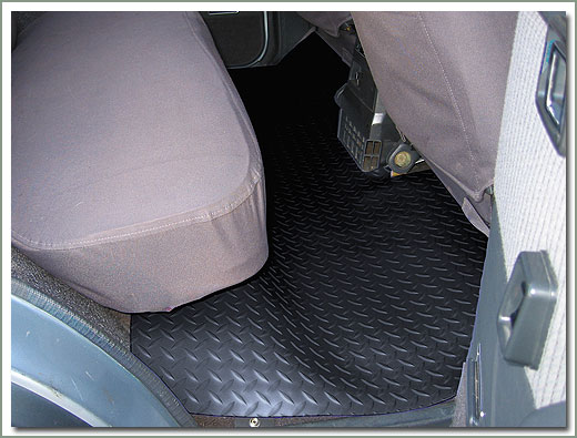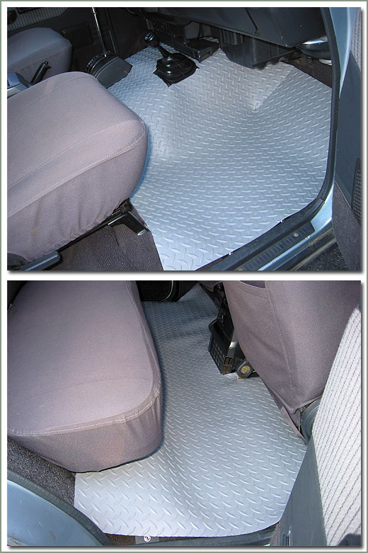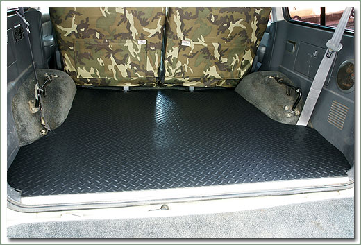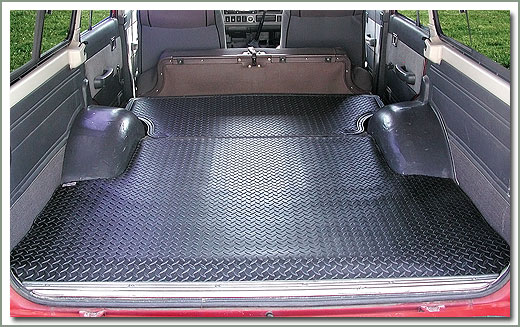 Specter can offer FJ60 and FJ62 wagon owners an attractive and durable SOR Tuff Tread Floor and Cargo Liners. Tuff Tread is a uniquely engineered diamond plated vinyl matting. For those of you who are looking for more coverage and protection than a carpet mat or a floor mat can give, these new liners are the perfect solution. SOR Front Tuff Tread Liner is a one piece mat which covers the entire front area floorboards. The 60 Series mats are marked for manual transmission, and the 62 Series are marked for automatic transmission, cut outs are required for installation. SOR Mid Passenger Tuff Tread Liners cover the foot well area from door to door, this mat requires trimming for your specific year and the coverage you desire. Specter also offers the matching Tuff Tread Cargo Liner which covers the entire cargo area and can be installed under the cargo area trim plates for secure fit. The Tuff Tread Rear Back Seat Liner is designed to cover the back of the passenger seat, and installs under the trim plates. When you fold down the passenger back the entire floor area is covered. These mats are easy to trim by using a matt knife or scissors. Perfect for the outdoors person who need the space to carry a lot of gear and equipment. Great for people who surf, snowboard, hunt, fish, etc. who need to carry wet or damp gear. Tuff Tread material provides a commercial grade vinyl product that has exceptional wear characteristics with a cool diamond plate pattern molded into it. It has a good resistance to normal oils, and meets the flammability requirement for Motor Vehicle Safety Standards. Easy to vacuum, and wipe clean. Available in Tuff Tread Black (BL), or Gray (GY).