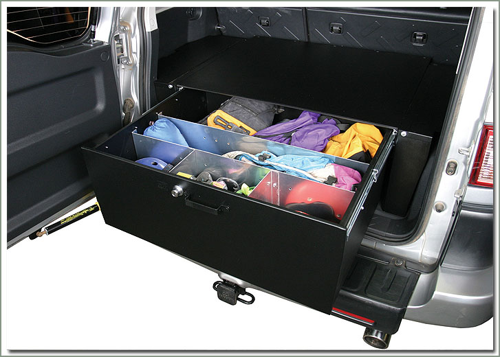 The Tuffy Cruiser Security Drawer provides lockable storage for valuables, such as tools, recovery gear, camping gear, and otherwise vulnerable objects. Foldable wings provide a full width platform on top of the drawer while still allowing access to the factory power outlet and jack location. These wings also create hidden storage space for smaller items. The drawer is constructed of heavy-duty 16-gauge steel with an attractive textured black powder coat finish. Each drawer is supported by a new drawer slide system incorporating smooth operating, sealed stainless steel roller bearings. Tuffy's Patented Pry-Guard II Locking System, featuring a 10 tumbler, double bitted lock and heavy duty latch, keep the drawer securely closed and locked. Included in the mounting of the drawer is a riser system which provides the option of easily mounting the drawer up to 4 inches higher so other objects, such as a tool case can be stored underneath. Mounts using factory holes; no drilling required. Dimensions: Exterior Dimensions: 56 ¾ in. W x 13 ½ in. H x 28 1/8 in. L. Storage Compartment Dimensions: 34 in. W (top); 33 in. W (bottom); 28 in. L; 13 1/2 in. H. Available in Black. UPS shippable |