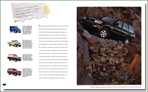 Some people collect comic books. Specter collects Land Cruiser Factory Sales Brochures. These 1998 100 Series sales brochures are in off-the-press mint condition, boxed for 15 years and include a spread featuring Marv's HJ45 and several other Specter vehicles. |