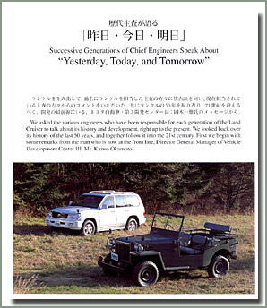 The Land Cruiser has set a world standard for 4x4 vehicles. This special edition on the Land Cruiser will look at the active role it plays in nearly every country around the world, and will include exclusive comments from the development staff and the production site. You will find a detailed explanation of how the Land Cruiser developed from the early days of the TOYOTA BJ through its evolution to the latest model. A must read for Land Cruiser fans! Features of the Land Cruiser special publication: Hard cover binding, 192 pages, bilingual text in English and Japanese, one time printing — don’t miss out. |