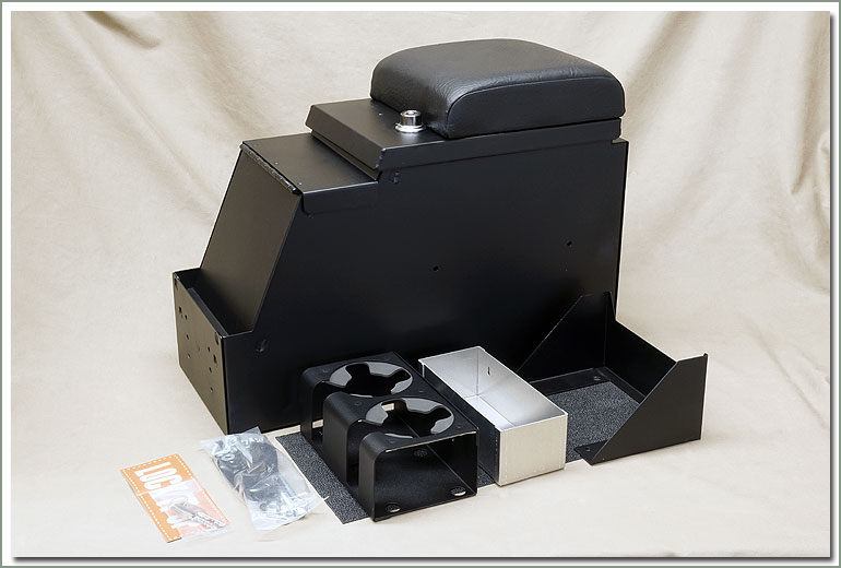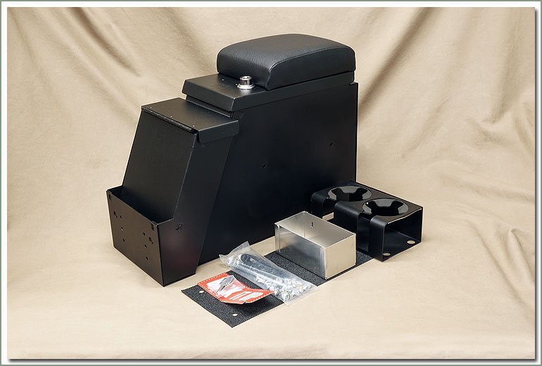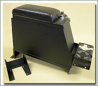 8 Inch Wide Tuffy Console With Stereo Compartment Black powder coated finish-Stereo compartment (locks under main compartment lid), main locking compartment, & two cup holders-24 inches long at the bottom, 12 inches long at the top, 8 inches wide, 16 1/2 inches high-Manufactured from 16 gauge steel that is machine formed with welded seams-Features Pry Guard locking system, neoprene rubber seals, arm rest pad (made from marine grade vinyl material) (Discontinued - Not available at this time) |