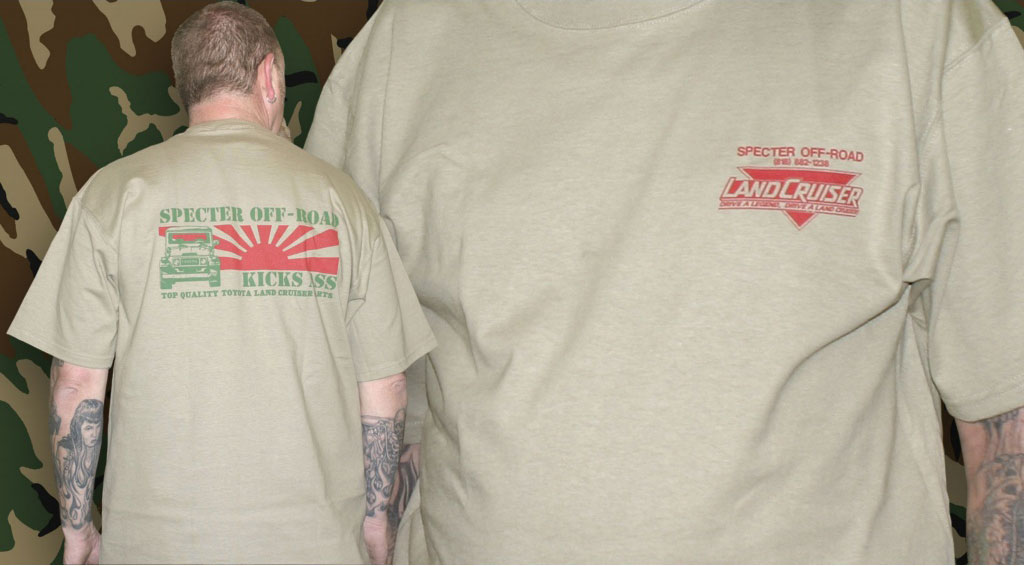 Specter Off Road Kicks Ass T Shirt Printed in red and green on a high quality khaki color T-shirt. Specter Land Cruiser logo on front, large rising sun and kicks ass logo on the back. Mens Medium On Sale - Everyone gets the Discounted Price on this part. Special Order - NO Return |